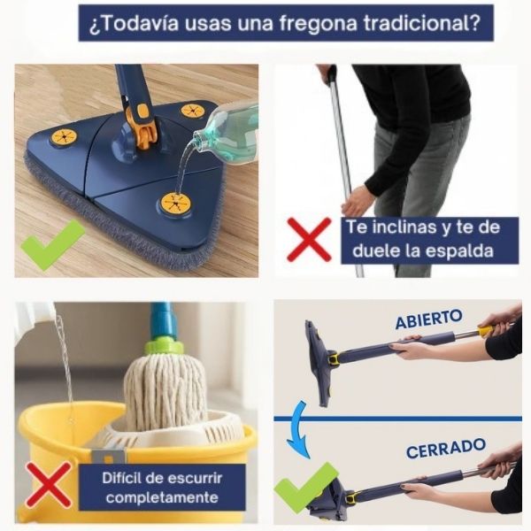 Su diseño triangular giratorio y su mango extensible te permiten limpiar fácilmente en rincones estrechos, techos y zonas altas. Limpia más cómodo, más seguro y sin esfuerzo